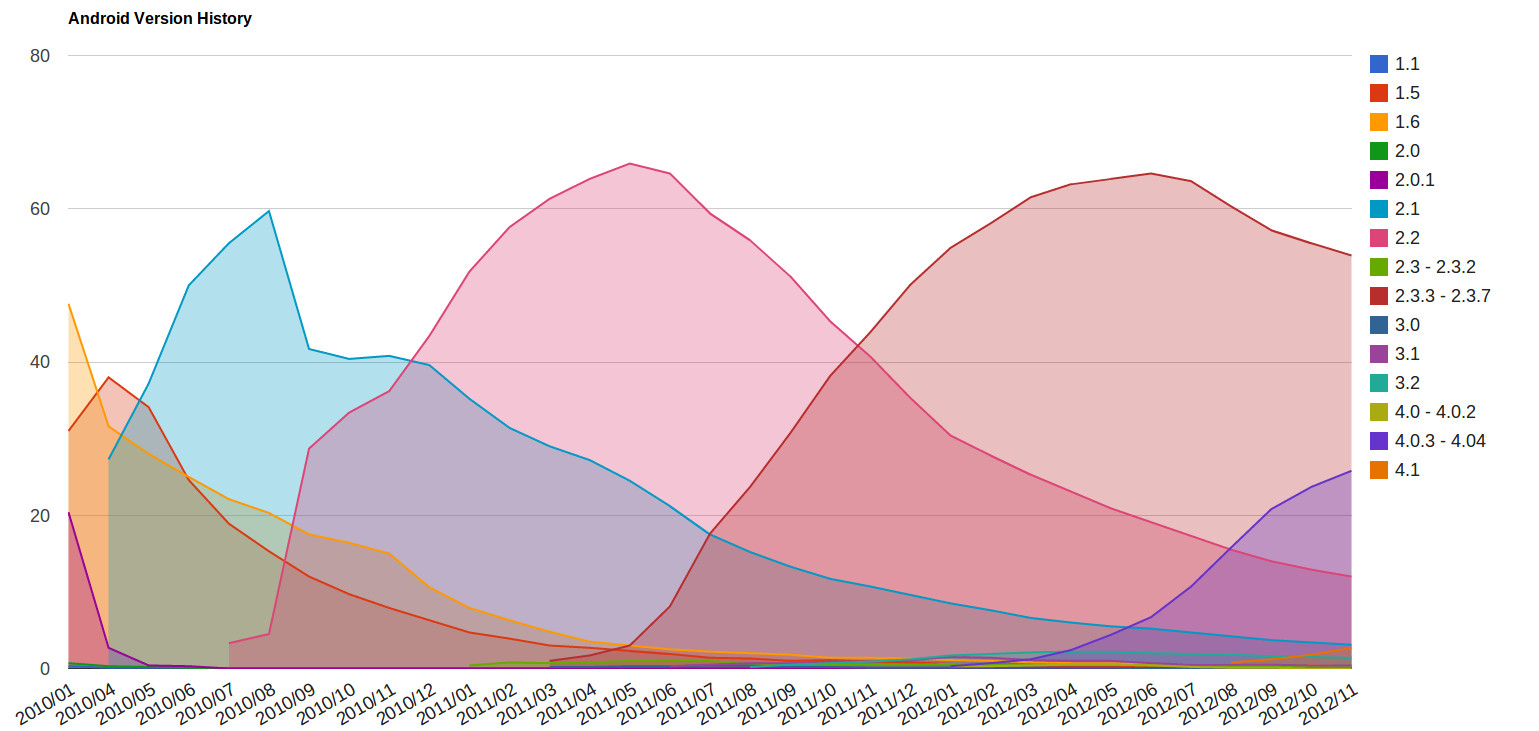 Android OSバーション別のシェアを2010年から現在(2012年11月)までのデータを調べてみました。
