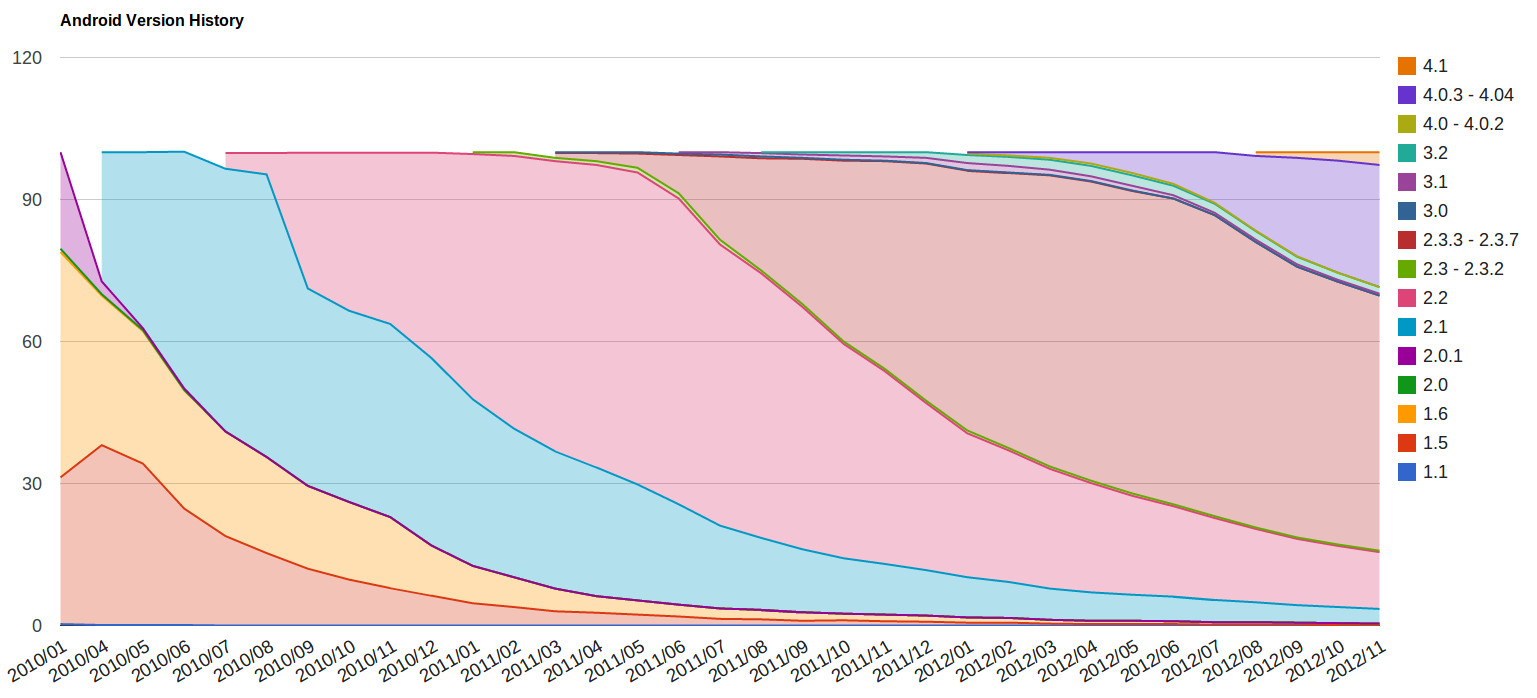 Android OSバーション別のシェアを2010年から現在(2012年11月)までのデータを調べてみました。