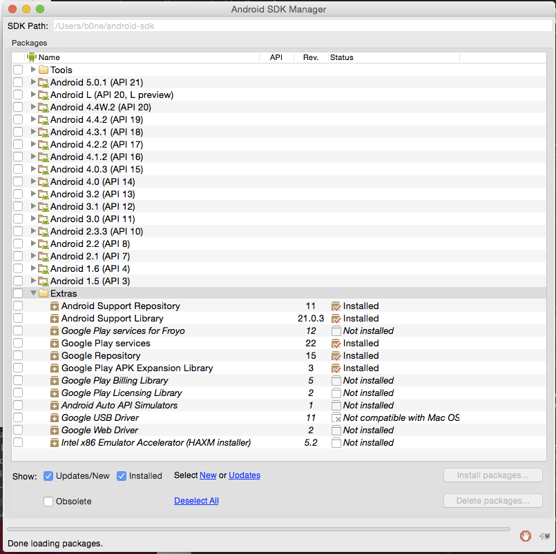 開発でよく使うデバッグツールのコマンドなど$ android で SDK Manager を起動する。バージョン別のSDKやビルドツールのバージョン更新を行うツール。